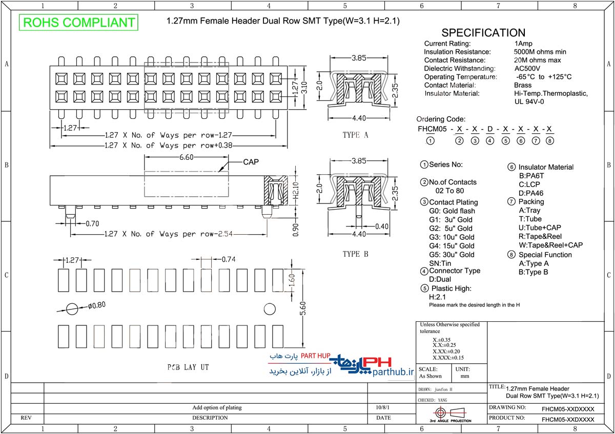 کانکتور پین هدر 2 در 40 پین 1.27 میلی متر مادگی اس ام دی