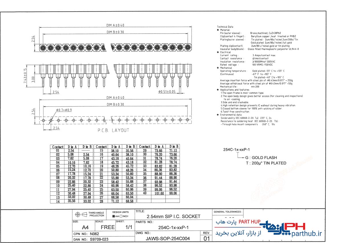پین هدر مادگی 1 در 40 نظامی (SIP) صاف 2.54mm