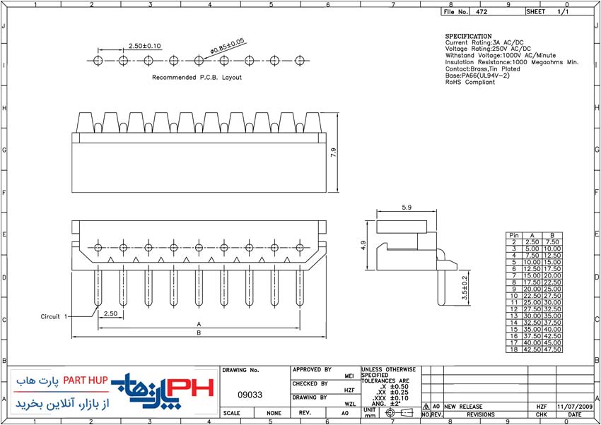 Pitch( فاصله مرکز تا مرکز بین دو پایه مجاور): 2.50 mm