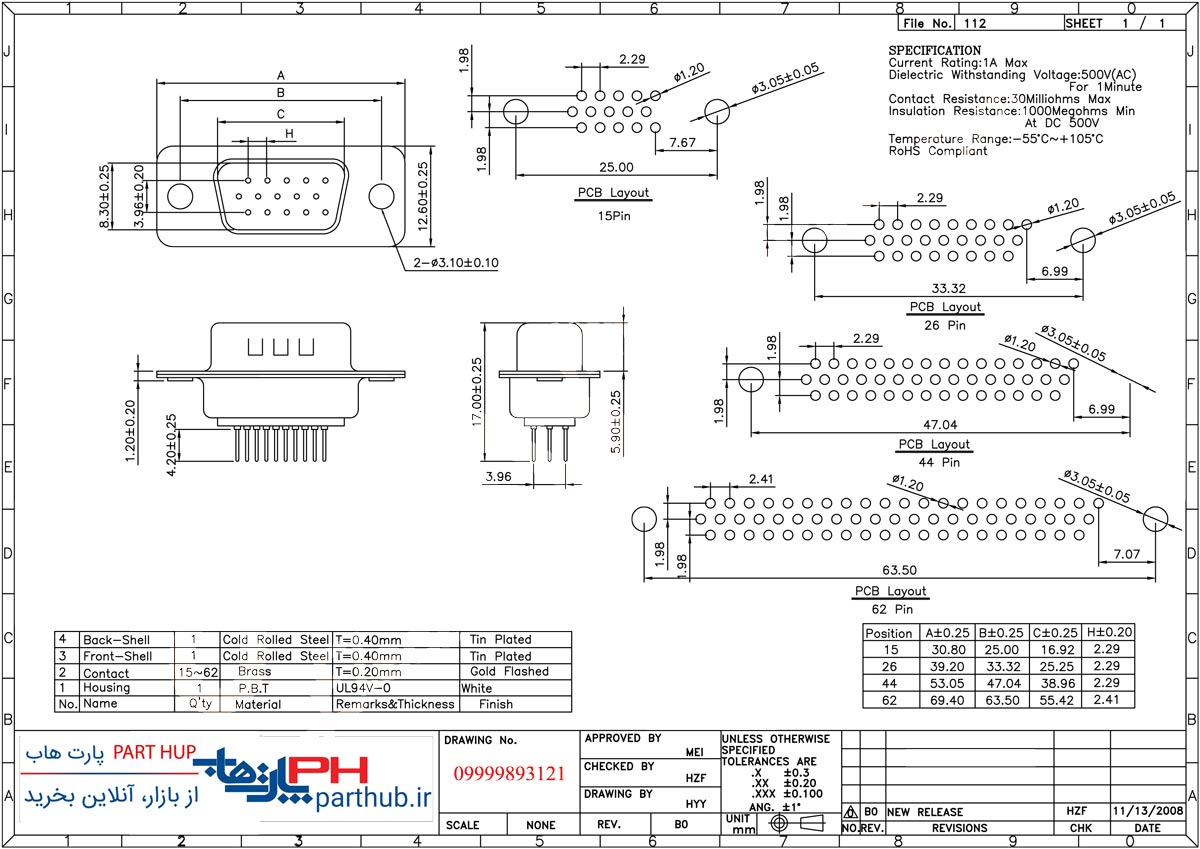 مشاهده گالری تصاویر D-SUB رو بردی صاف سه ردیفه (HD) ماده 15 پین