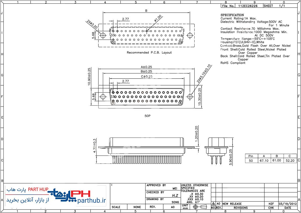 کانکتور D-SUB رو بردی صاف (Vertical) صنعتی ماشین پین ماده با فاصله بین پایه 2.77 میلی متر سه ردیفه