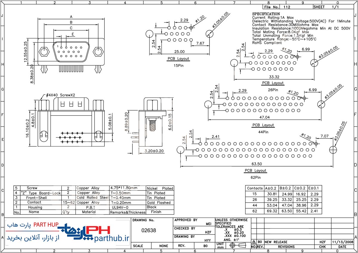 کانکتور D-SUB رو بردی نود درجه (RA) صنعتی ماشین پین ماده با فاصله بین پایه 2.77 میلی متر سه ردیفه (HD)